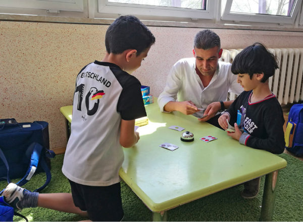 Ein paar Wochen später trafen sich arabische Mütter in der kleinen Hortküche, kochten ein riesiges Mahl für alle, und da fanden selbst die deutschen Kinder: „War lecker.“ Ausgerechnet an diesem Tag kam Rizan, der mit Frau und Kind aus Syrien geflüchtet war, zum ersten Mal in den Hort, um zu dolmetschen, und sagte: „Hier bleibe ich. Hier gibt es gutes arabisches Essen.“ Jana erklärte ihm, dass sie ihn nicht bezahlen könne. Das hielt Rizan aber nicht ab, denn ihm ging es darum, Deutsch zu lernen. Von montags bis freitags kam er für je zwei Stunden, übersetzte bei Gesprächen mit Eltern, übertrug die Willkommens-Hefter ins Arabische und half beim Ausfüllen von Anträgen. Mit den Kindern aus seinem Land kam er schnell in Kontakt, denn er war für sie Heimat.