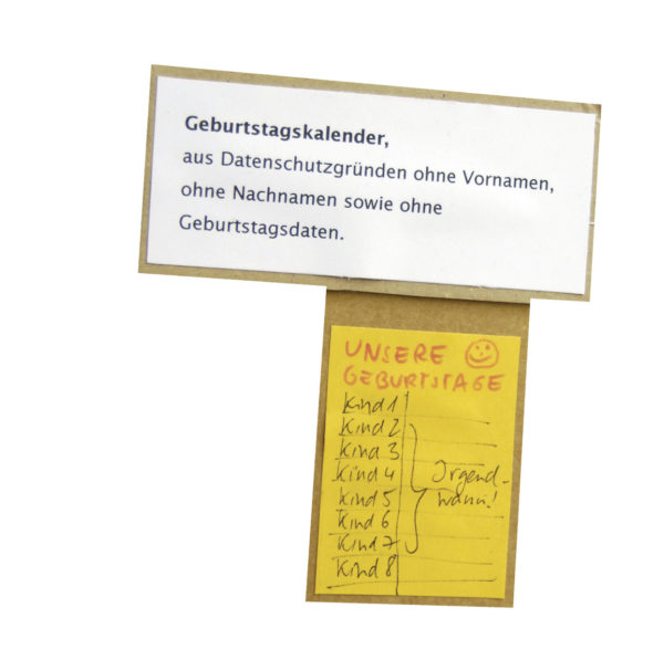 Die Kinder sprechen wir natürlich erst recht nicht mit Namen an, weil ja sonst alle in der Gruppe automatisch jeden Namen lernen. Wir verwenden konsequent Kosenamen. Das klappt gut. Wenn niemand in der Gruppe Malte als Malte kennt, aber alle als „Unser Kamuffelchen“, ist Datenmissbrauch kaum mehr möglich. Zumal wir ab dem nächsten Monat vorhaben, die Namen regelmäßig rotieren zu lassen.“
