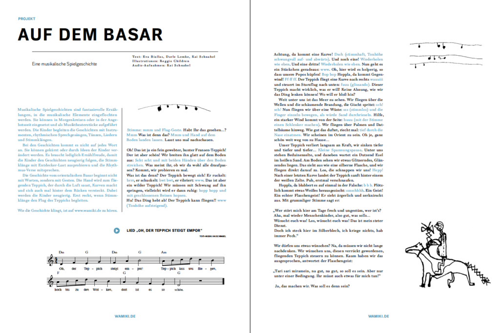 Bei den Geschichten kommt es nicht auf jedes Wort an. Sie können gekürzt oder durch Ideen der Kinder verändert werden. Es braucht lediglich Erzählfreude, damit die Kinder den Geschichten neugierig folgen, die Stimmklänge mit Entdecker-Lust ausprobieren und die Rhythmus-Verse mitsprechen. Die Geschichte vom orientalischen Basar beginnt nicht mit Worten, sondern mit Gesten. Die Hand wird zum fliegenden Teppich, der durch die Luft saust, Kurven macht und sich auch mal hinter dem Rücken versteckt. Dabei werden die Kinder neugierig. Erst recht, wenn Stimmklänge den Flug des Teppichs begleiten.