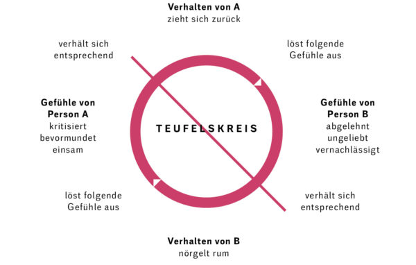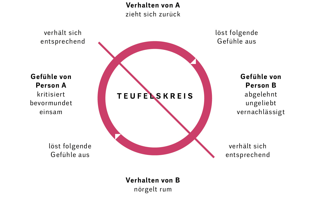 Sehr hilfreich in Konflikten ist immer ein Blick von außen oder oben. Versuchen Sie, aus der Vogelperspektive auf den Konflikt zu schauen und herauszufinden: Was ist los? Wer ist beteiligt? Um wen oder was geht es wirklich? Wie verhalten sich die Beteiligten? Wie äußert sich das? Was genau ist der Kern des Problems? Dabei hilft, sich bewusst zu machen, dass möglicherweise ein Teufelskreis existiert. Dieser Begriff geht auf Paul Watzlawick zurück. Weiterentwickelt wurde das Modell, mit dem negative Spannungen in Beziehungen erfasst, Hintergründe begriffen und Fallen erkannt werden können, von Christoph Thomann und Friedemann Schulz von Thun. Mit Hilfe des Modells lässt sich einerseits darstellen, was die äußerlich sichtbaren und wirksamen Verhaltensweisen oder Äußerungen der Konfliktparteien sind. Andererseits sind auch die inneren Reaktionen Bestandteile des Teufelskreises, zum Beispiel Gefühle. Sobald ein Konflikt sichtbar gemacht werden kann, greift die Eigenverantwortung, und ein konstruktives Vorgehen wird möglich.