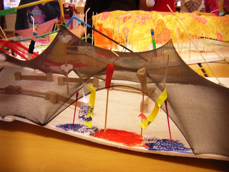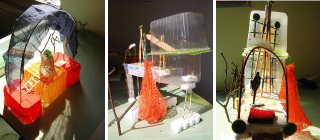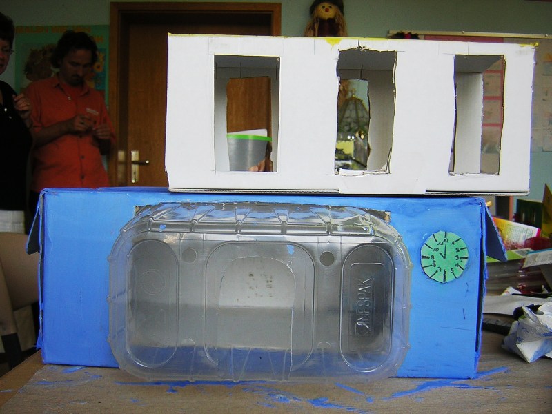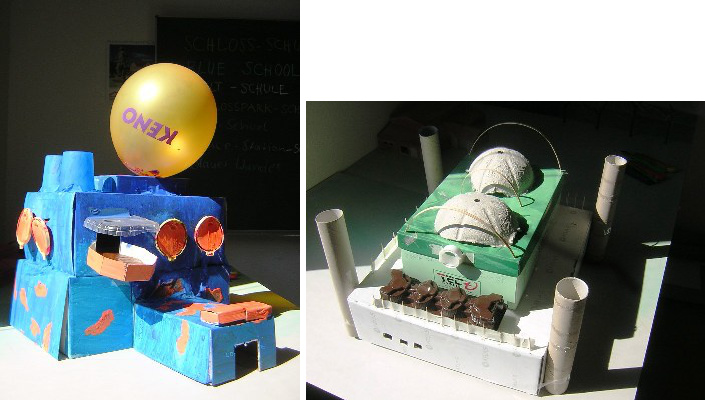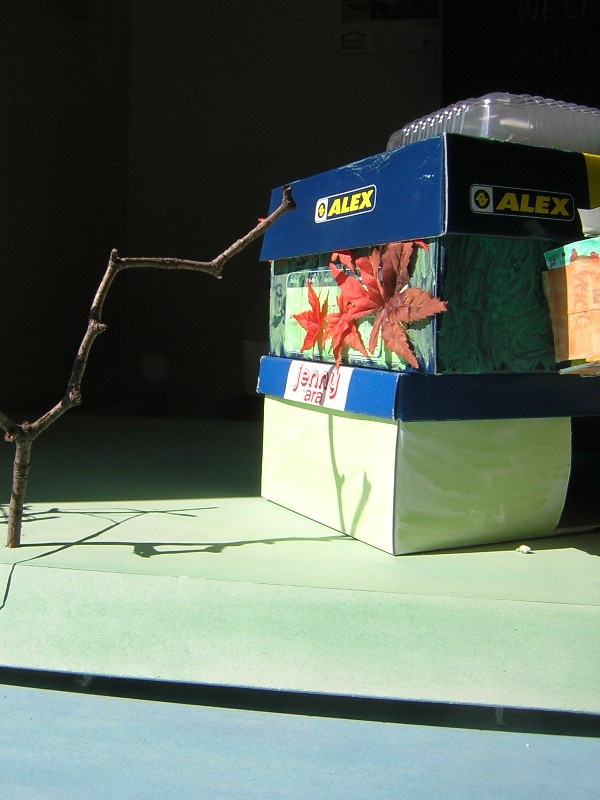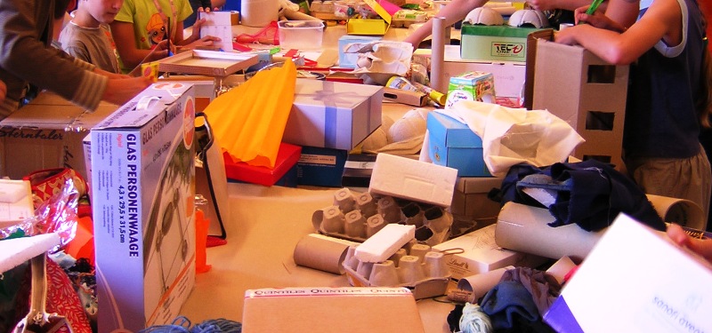 „Oh Mann, das ist gemein!“ Tobias schmeißt seine Tasche in die Ecke. Was ist passiert? Die Schuhkartons sind weg! Und sie sind sogar VERBOTEN! So steht es auf der Tafel. Große Aufregung im Klassenzimmer. Und zunächst mal Ratlosigkeit- was nun? Große, kleine, dicke, dünne, schmale, breite, flache, hohe, rote, blaue, weiße, schwarze, mit und ohne Beschriftung, Logos oder Bilder, mit und ohne Deckel, gefaltet oder geklebt- aber immer eckige- Schuhkartons sind einfach nicht mehr da. Dafür liegen andere Objekte und Materialien auf dem großen Ateliertisch, den wir für den unseren Workshop aus vielen einzelnen Schülertischen zusammengerückt haben: Plastikschalen aus dem Verpackungsbereich in verschiedenen Größen, Formen und Farben, Obstnetze, Stoffreste, Nylonstrümpfe, Luftballons, Mikadostäbe, Schaschlikspieße, Zahnstocher, Styroporreste aus Verpackungen in unterschiedlichen Größen und Formen, Wolle, Draht, Papier- und Pappstücke…. nur die Schuhkartons fehlen.
