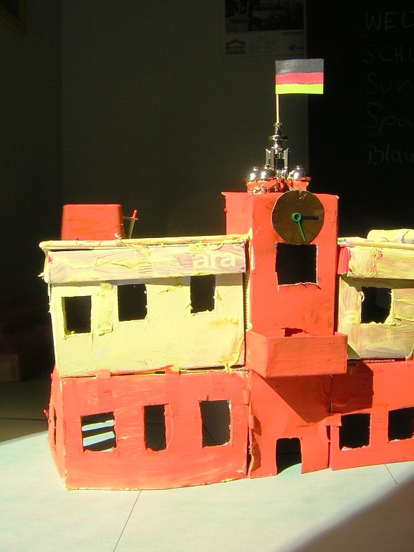 Die spontane Abwehrreaktion der Kinder am zweiten Tag erklärt sich also durch den Wegfall einer bequemen, stabilen, in sich bereits fertigen Konstruktion, die starke Regeln bietet und Sicherheit schafft. Diese dominante Vorgabe verführte zu schnellen und praktischen Bauergebnissen. Kreative Weiterbearbeitung der fertigen Volumen blieb die Ausnahme. Es ist eigentlich wie in der Architektur: ein abgegrenztes, kompaktes Bauvolumen, eine regelmäßige, unkomplizierte Fensterreihe sind verlässliche Lösungen für eine unkomplizierte und bequeme Planung, eine einfache Statik, überraschungsfreie Bau-und Ausstattungskosten und eine konfliktfreie Raumaufteilung. Bequemlichkeit pur also auf ganzer Linie, in allen Phasen, für alle Beteiligten. Im Workshop hat sich nach den ersten schnellen Bauergebnissen mit den Kartons tatsächlich auch Langeweile ausgebreitet. Fertig- und jetzt?
