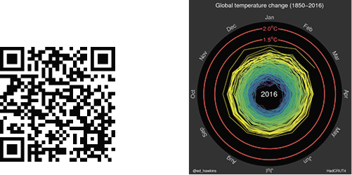 Die Erwärmungsstreifen von Hawkins sind die wohl eingängigste Infografik zur Erderhitzung, die man sich denken kann: In ihnen ist die jeweilige Mitteltemperatur eines einzelnen Jahres (an einem bestimmten Ort) als schmaler Farbstreifen dargestellt, dabei steht dunkles Blau für kühl und dunkles Rot für warm – aneinandergereiht ergeben diese schmalen Streifen einen Strichcode, bei dem auf den wirklich allerersten Blick erkennbar ist, wie sehr sich in jüngster Zeit die warmen Jahre häufen.