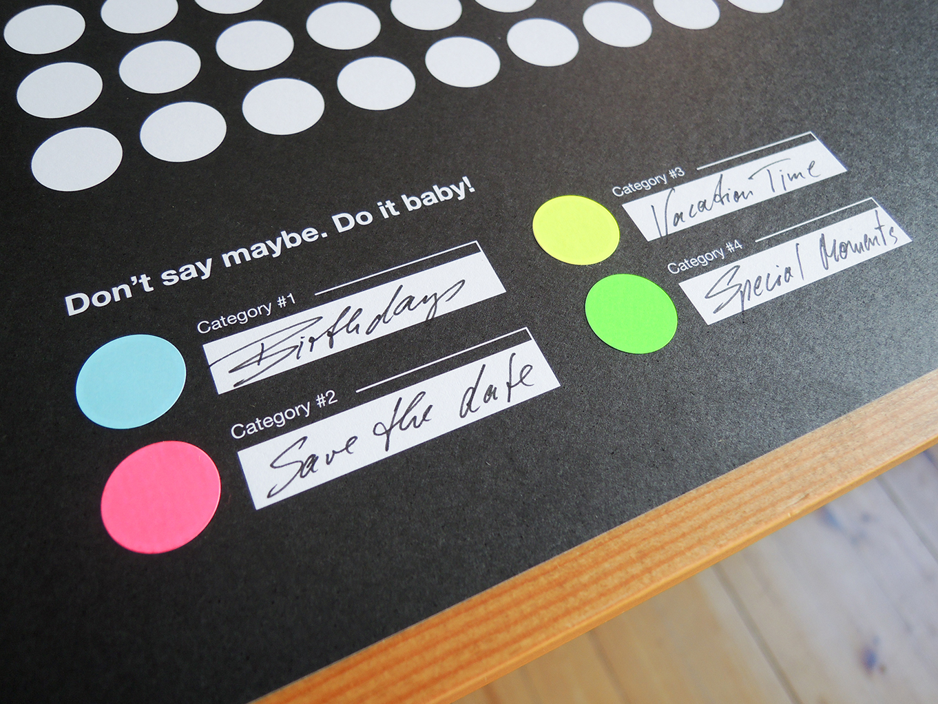 Hurra, da ist er: der Kalender zum Planen von kleinen Freuden und zum Sammeln von großen Erinnerungen. Tage am Meer, Termine, Lottogewinne, Herzenssprunge, zufällige Begegnungen, überwundene Schweinehunde und alle sonstigen geplanten und ungeplanten Hohepunkte des Jahres können im Kalender farbig markiert und festgehalten werden. Je nach Wahl auf Schwarz oder Weiß. Dafür gibt es je 150 Klebepunkte in vier leuchtenden Farben, die vier individuell definierbaren Kategorien zugeordnet werden können.