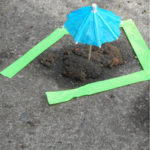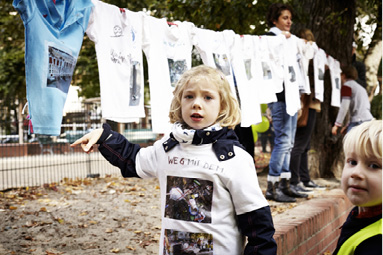 Weil die Kinder ihre Zeigefinger nicht im Stadtraum lassen können, stellen sie Gipsabdrücke ihrer Finger her und heben unschöne Zustände im Kiez damit hervor. Die Sammlung aller „Das-mag-ich-nicht“- Fotos wird schnell zur performativen Installation – wir drucken sie auf ausrangierte Kinder-T-Shirts und hängen sie für die Zwischenpräsentation auf eine 10m lange Wäscheleine auf dem Ludwigkirchplatz zwischen Spielplatz und Cafes. Die erste Rebellion hinterlässt ihre Spuren! Sie regt in den folgenden Wochen im Kiez eine fröhliche Diskussion über die Unorte der Kinder an. Die Abstimmung der Kinder ergibt, dass Lösungen für zu viele Zigarettenkippen und Hundehaufen hermüssen! Für alle Kinder ist es sonnenklar, dass hier die Hunde keine Schuld trifft, sondern die Halter sich besser um die Hinterlassenschaften kümmern müssen. Also wollen sie diese mit mehr Schaufeln, Tüten und Hinweisen zu Mülleimern ausstatten.