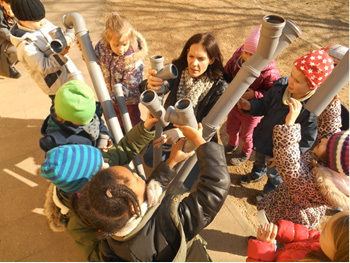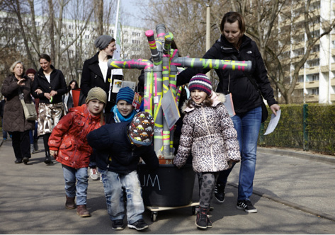 Genau hier setzt das Projekt „Stadt-Rebellen – 1 km2 x anders“ an. Das Einmischen und die Partizipation von „Kindesbeinen“ an sind die Grundgedanken dieses Kooperationsprojektes des Labyrinth Kindermuseum Berlin und der kleinen baumeister. Die Stadt „rebellisch“ mit zu gestalten, ist für Mädchen und Jungen Herausforderung, Spaß und essentielle Lernerfahrung zugleich. Nacheinander erforschen in sechs Berliner Stadtteilen jeweils eine Kita-Gruppe und eine Grundschulklasse als Tandem einen Quadrat-Kilometer Stadt in ihrer unmittelbaren Umgebung. Dabei lernen die Kinder, wie eine Stadt entsteht, wie sie funktioniert und wie sie selbst aktiv in dieses Stadtgefüge eingreifen können. Nach der Forschungsphase im Kiez stellen die Mädchen und Jungen in einer öffentlichen Zwischenpräsentation die aus ihrer Sicht wichtigsten Probleme ihres Stadtumfelds vor. Sie stimmen hier demokratisch ab, welches der präsentierten Probleme sie dauerhaft angehen möchten. Auf dem Weg zur nachhaltigen Problemlösung, die wiederum in einer Abschlusspräsentation der Öffentlichkeit vorgestellt wird, treten sie immer wieder mit kreativen Aktionen im Stadtbild in Erscheinung.