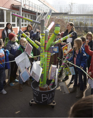 Vom Süden Berlins erreichen die StadtRebellen nun den Osten – mit all seinen faszinierenden Plattenbauten, deren Fensterformen und Fassadenmuster die Kinder auf der Kiezbetrachtung sofort dokumentieren. Schon unmittelbar vor unseren Expeditionen formulieren die Kitakinder einen Missstand: Es gibt viel zu viele Hundehaufen und Glasscherben rund um ihre Kita! Also gehen wir ausgerüstet mit Sprühkreide und Eisschirmchen los, um auf dieses Problem aufmerksam zu machen. Alle Scherben werden auf dem grauen Asphalt leuchtend grün hervorgehoben und alle Haufen bekommen ein Schirmchen. Dekoriert fallen die Haufen nicht nur sofort ins Auge, es sieht auch fast hübsch aus und ein Kind flüstert leise: „Ach, wenn doch jedes Häufchen eine Blume wäre!“ Die Schulkinder formulieren auf den von ihnen im Anschluss angefertigten Zeichnungen in Sprechblasen ihre Wünsche: Solarbetriebene und fliegende Fortbewegungsmittel, fröhlichere Fußwege und kostenlose Bücher für alle Alle! Bei der Zwischenpräsentation werden die Anliegen der Kindergruppen illustriert durch bunte Gläser und Bilder in großflächiger Folie, aufgespannt zwischen den noch kahlen Winterbäumen im benachbarten Park. Sie sind Entscheidungsgrundlage für die Abstimmung. Schnell ist klar: Alle Kinder wünschen sich kostenlose Bücher! Jetzt benötigen wir Buchspenden und Orte, an denen sie getauscht werden können: Kein Problem für die StadtRebellen. Ausrangierte und oft gelesene Werke finden ihren Weg in die Sammelkiste. Als Tauschort wäre der Park toll, denn da kommen die meisten Kinder auf dem Hin- und Rückweg zur Kita und Schule vorbei. Wir verwerfen die Idee, die vielen Bäume im Park als Orte für den Buchtausch zu nutzen, da wir die Bäume nicht verletzen wollen – also entwerfen wir kurzerhand einen eigenen, robusten und pflegeleichten „Baum“!