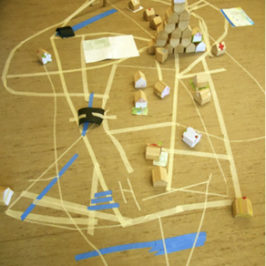 Was ist eine Stadt? … und „Wie entsteht eine Stadt?“ sind die grundsätzlichen, ersten Fragen, die wir uns stellen. Die Antworten werden je nach Altersstruktur als großflächige, gemeinsame Zeichnungen, kleinteilige „Post-it“-Notizen, Piktogramme oder Wörter, Geräusche oder digitalisierte Gespräche gesammelt und festgehalten. Individuelle Spiele und Mitmachgeschichten zum allgemeinen Thema der Besiedlung von Land lassen die Kinder in das Thema eintauchen und die Komplexität der Entwicklung vom Dorf zur Großstadt mit all ihren Feinheiten, „Fallstricken“ und ihrer künstlerischen Freiheit begreifen. Über die Zeichnungen so genannter „mental maps“, individueller Schul- und Kitaweg-Pläne erarbeiten sich die Kinder die zweidimensionale Darstellung von Stadtplänen und Landkarten, die die Welt auf Papier strukturieren und kategorisieren. Darüber hinaus lassen sich individuelle Fragen und Forschungsgebiete durch die „mobile Fach-Bibliothek“ der kleinen baumeister beantworten. Je nach Alter setzen mathematische Einheiten zu Längen, Höhen und Breiten von städtebaulichen Elementen oder auch naturwissenschaftliche Exkursionen zu Pflanzen und Tieren in der Stadt weitere Impulse. Mit den Fragen „Was gefällt mir an meiner Stadt?“ und „Was gefällt mir nicht an meiner Stadt?“ gehen wir zum Projektabschnitt Nr.