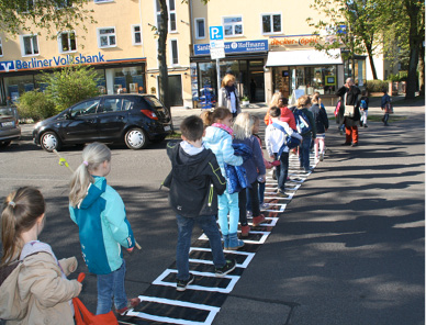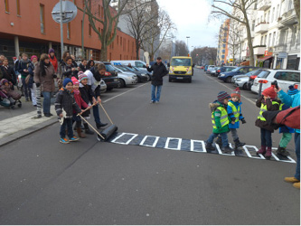 Auf der gemeinsamen Zwischenpräsentation an der stark befahrenen Hauptstraße tauschen sich die Gruppen mit dem Megaphon aus und lassen aus dem gefundenen Müll eine Gipsskulptur entstehen, die später im Museum zu sehen sein wird. Sie wählen fast einstimmig, sich um die gefährlichen Straßenübergänge zu kümmern. In der Realisierungsphase werden Ampelphasen gestoppt und gefilmt. Mithilfe einer Verkehrspolizistin werden Gefahrensituationen analysiert und Verkehrs-und Präventionstraining mit Kitakindern und MELO-Schülern absolviert. Da die Beantragung eines Zebrastreifens nach Erkundigungen der Kinder im Rathaus sehr viel länger dauern würde, als das Projekt Zeit hat, wird ein „Verkehrssicherheitsmobil“ entwickelt: Auf einem umgebauten Bollerwagen finden sich verlängerte Spiegel, um über parkende Autos zu schauen, Schablonen zur Markierung unübersichtlicher Einfahrten auf Fußwegen, Stopp-Kellen zur Straßenabsicherung und ein 6 m langer ausrollbarer Zebrastreifen zur Straßenüberquerung. Zur gemeinsamen Abschlusspräsentation gibt es neben Ampelmännchen-Keksen und Theaterstücken der MELO-Schüler*innen also auch einen kurzzeitigen Stau auf der Motzstraße, als die Kinder mit ihrem nigelnagelneuen Zebrastreifen die Straße überqueren!
