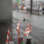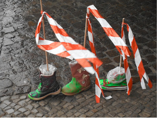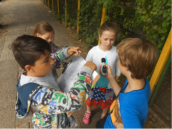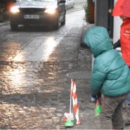 Parallel schauen sich fünf Gruppen ihren Kiez genauer an und finden erstaunlicherweise drei große Oberthemen: Sie entdecken unglaublich viel Verschmutzung und Müll, laute und gefährliche Straßenkreuzungen mit kurzen Ampelphasen bzw. zu wenig Zebrastreifen sowie zu wenig Orte, die zum Verweilen und Ausruhen einladen. Schon in der Erkundungsphase hinterlassen die Kinder ausrangierte und bemalte Kinderschuhe mit Fähnchen im Stadtbild oder verwandeln Poller mit Klebeband zu auffälligen Kunstwerken.
