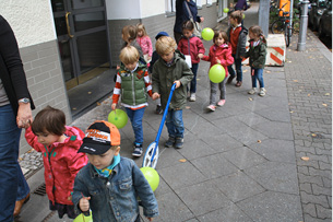 Der Startschuss des Projektes fällt für eine Kitagruppe und eine Grundschulklasse in Wilmersdorf. Während die Schüler*innen ihren 1km2 großen Bezirk in alle Richtungen nach vier selbstgestellten Themen ablaufen und analysieren, markieren die Kitakinder in forschem Tempo auf einer Strecke von 578m mit Luftballons ihre Lieblingsorte. Was wir nicht mögen, da zeigen wir drauf!