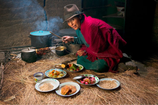 Maria Ermelinda Ayme Sichigalo, 37 Jahre, Mutter von acht Kindern, Hebamme und Bäuerin in ihrem aus Lehm erbauten Küchenhaus, Ecuador, Typische Tagesration