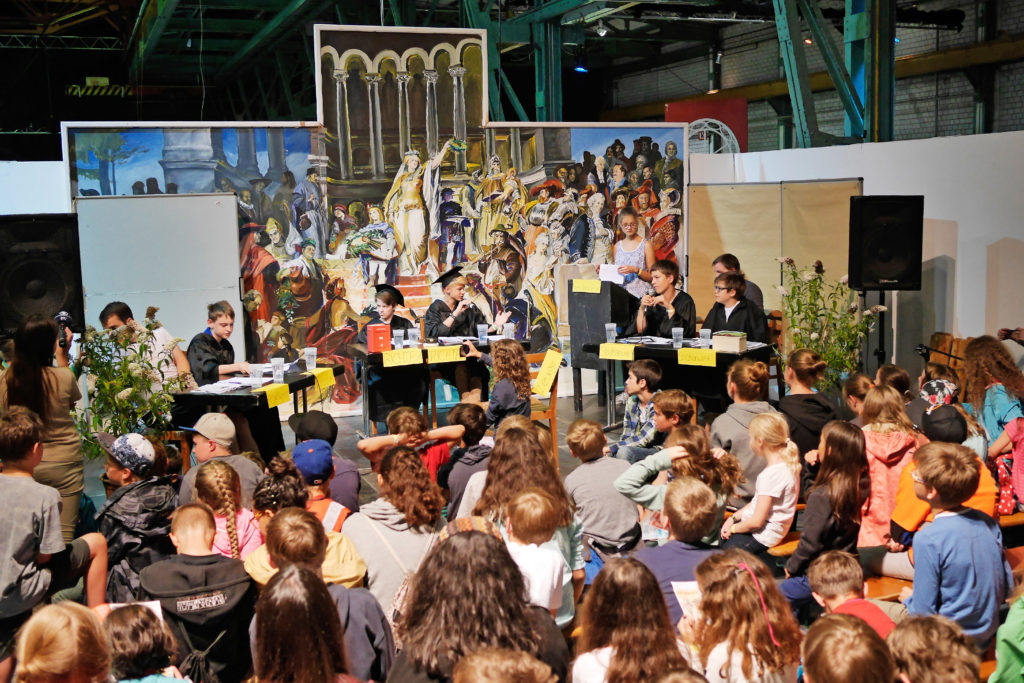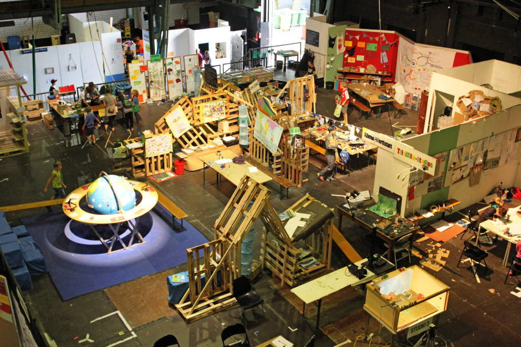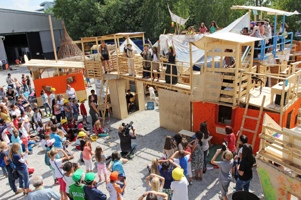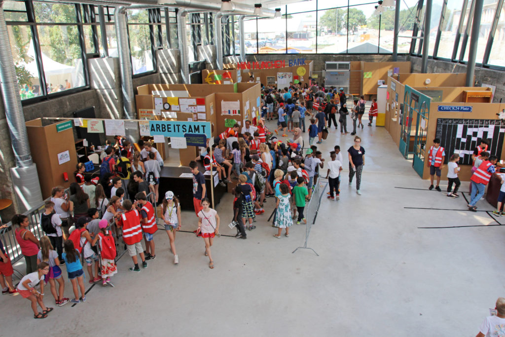 Nun geht’s los. Punkt 10 Uhr. Die Hallentore werden geöffnet. Die Kinder rennen. Manche rasen zum Ziel, das sie schon kennen. Es gibt das Rathaus und Handwerksbetriebe, das Gasthaus, die Comenius Hochschule und die Bank und das Arbeitsamt, auch Müllabfuhr, Theater, Kino und Fernsehen. 68 Einrichtungen. Die Kinder sind Bürgermeister und Taxifahrer, Gärtner und Hochschullehrer. Es gibt Märkte und Wahlen, Müllsammelaktionen und natürlich Feste. Das Botschaftsgebäude wird in diesem Jahr von Kindern aus Indien, Japan und europäischen Städten gestaltet. Dort gibt es nämlich Ableger dieser in München kreierten Idee. Zentral ist in diesem Jahr der Klimaschutz mit einem Wertstoffhof und einem Forschungsinstitut. 200 Erwachsene sind die Mentoren: Pädagogen, Künstler, Handwerker, Studenten und Wissenschaftler, kurz: erwachsen gewordene Erwachsene, Leute, bei denen die Kinder aus erster Hand die Dinge und das Können, also die Welt kennenlernen, auf die Kinder so hungrig sind.