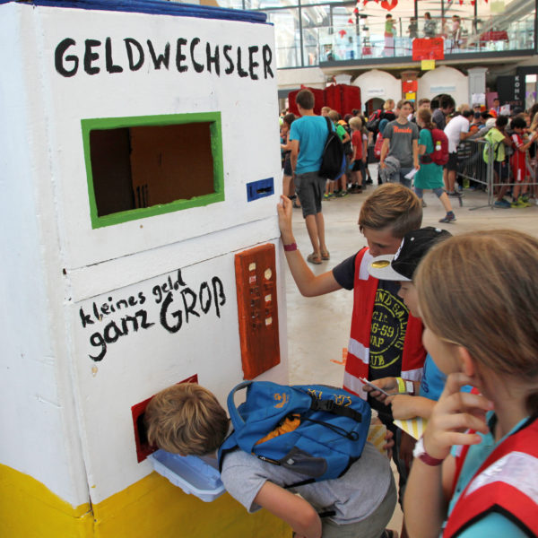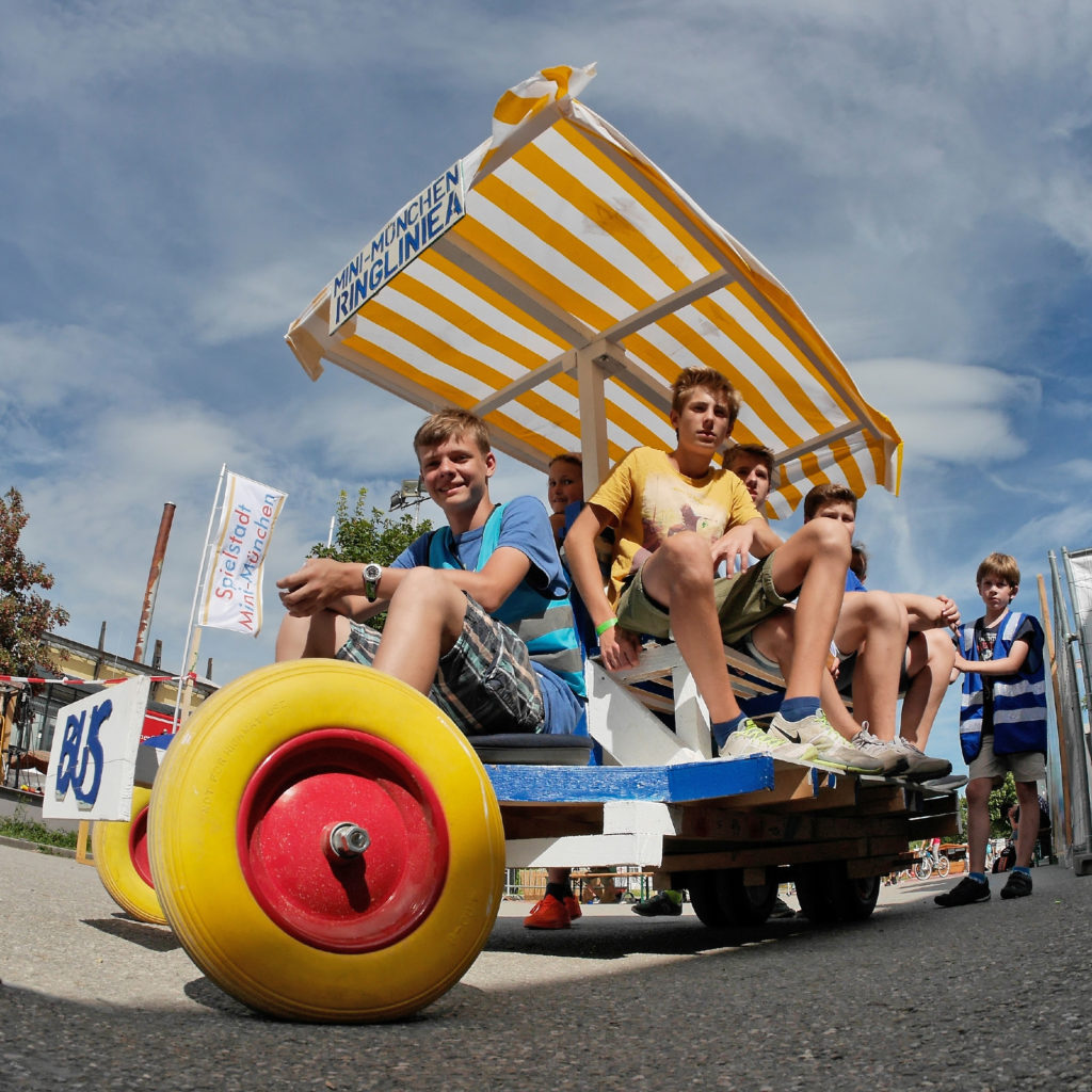 Die Kinder stehen geduldig in der Schlange. An diesem ersten Ferientag scheint die Sonne. Wunderbare Augustsonne. Manche sind in Begleitung von Müttern oder Vätern gekommen. Viele sitzen auf dem Boden, beraten woran sie teilnehmen wollen. „Will ich diesmal Vollbürger werden?“ „Gehe ich lieber gleich arbeiten oder erst mal studieren?“ Sie füllen den Mini-München Mitspielpass aus oder lesen die Regeln. Die 10. heißt, „Wer Regeln aufstellt, kann sie auch verändern.“ Das macht die Bürgerversammlung. Es gibt schon viele Regeln und Traditionen, denn Mini-München findet in diesem Sommer zum 18. Mal statt. Alle zwei Jahre in den großen Ferien. Manche Eltern waren bereits als Kinder dabei. Viele der Betreuer auf dem Bauhof, im Rundfunkstudio oder im Gasthaus „Zur Fetten Sau“ sind Ehemalige.
