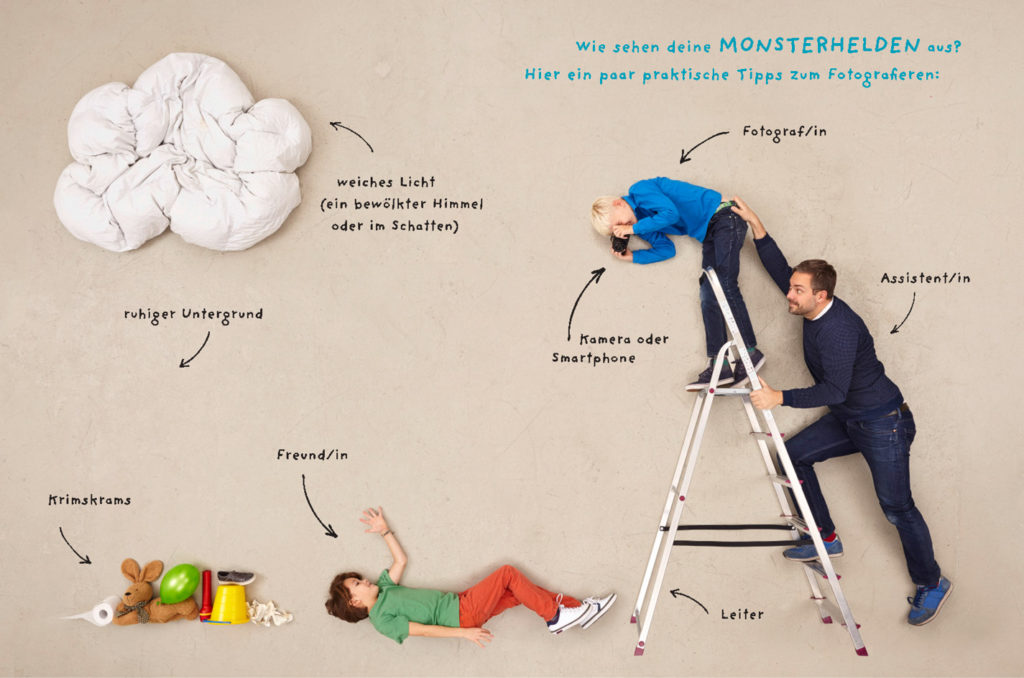 Jan von Holleben erfindet in seinem Buch: MONSTERHELDEN witzig-irritierende Bilderwelten mit gigantischen Fantasiefiguren. Der Fotograf setzt seine Figuren aus Alltagsgegenständen und gemeinsam mit Kindern eindrucksvoll in Szenen, die er von oben fotografiert.