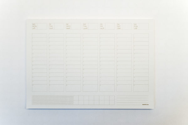 Der Block zur übersichtlichen Wochenplanung und als Deskpad für Deinen Schreibtisch. Auf jedem Blatt findet eine Woche Platz. Jeder Block besitzt einen großzügigen Jahresvorrat an Vorlagen. Das offene wamiki-Lieblingspapier besitzt eine sehr schöne Haptik, verträgt sich bestens mit Mouse, Stift sowie Radiergummi und ist ausreichend stark, um deutlich mehr als eine Woche eine gute Figur zu machen.