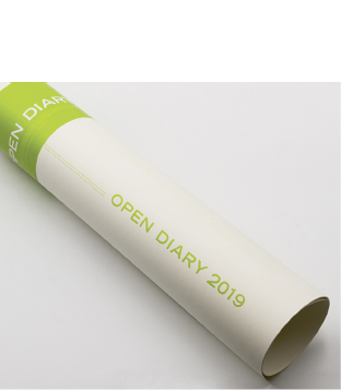 Open Diary 2019. The art of living – Kalender-Plakat. Gedruckt auf Fly 02 bläulichweiß 300 g/qm von Cordier in Sonderfarbe Optimistengrün Pantone 382U. Format 70 x 100 cm.