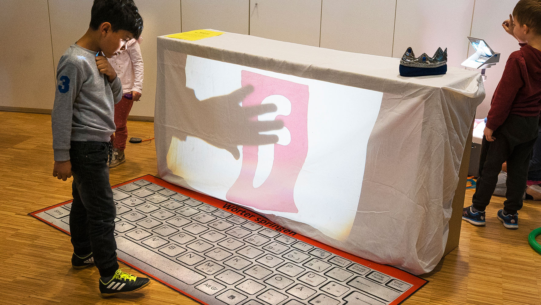 Einer springt vorne auf der Tastatur – dem Spielteppich – die Buchstaben. Die anderen kümmern sich um den Bildschirm. Dafür legt ihr auf dem Projektor bunte Bilder oder interessante Schatten. Spielt, bis euer Akku leer ist!
