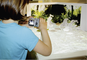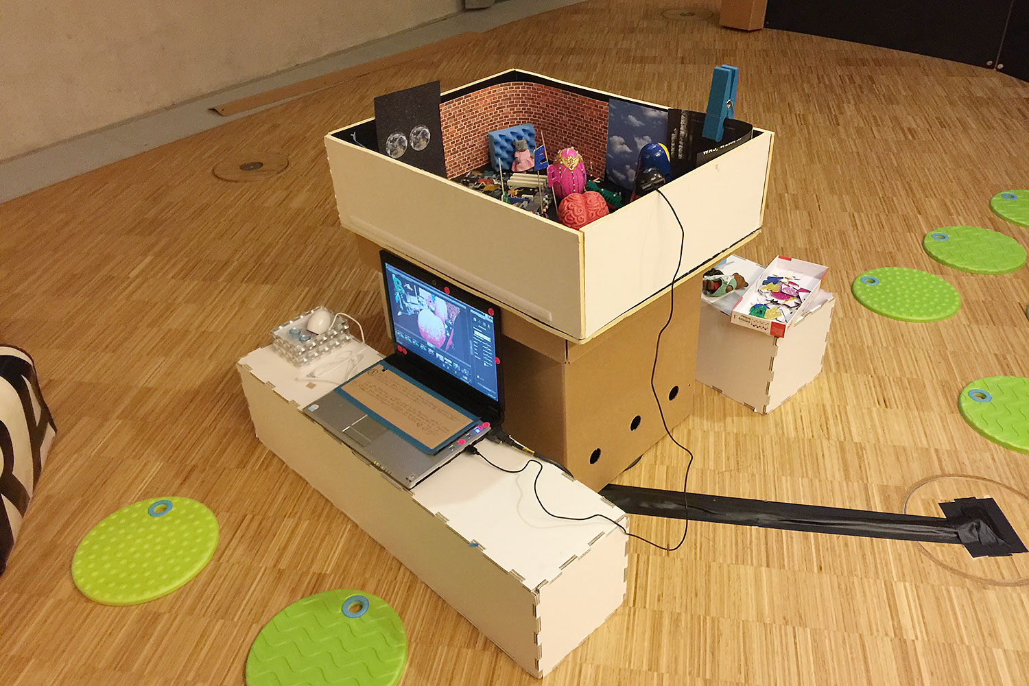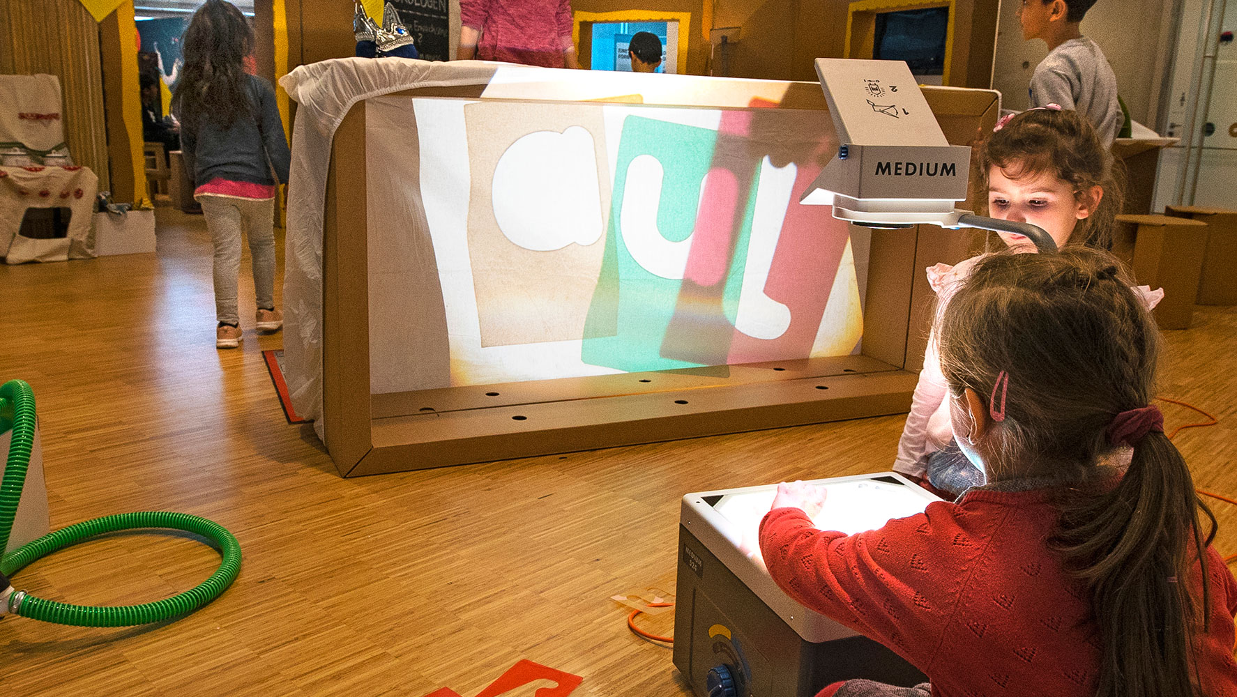 Kleines Spiel-Zeugs auswählen, es in den schwarzen Kasten setzen und schauen, wie das Zeugs auf der Kinoleinwand aussieht. Überlegt euch Geräusche dazu und macht eine kleine Aufführung. Wenn ihr wollt, könnt ihr auch den Film aufnehmen.