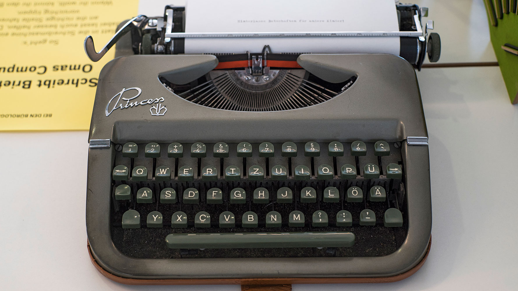 So geht’s: Blatt in die Schreibmaschine einstecken, dabei lasst euch besser helfen. Das Blatt an die richtige Stelle fahren, vorsichtig tippen. Wenn ihr wollt, könnt ihr den Brief per Rohrpost versenden.