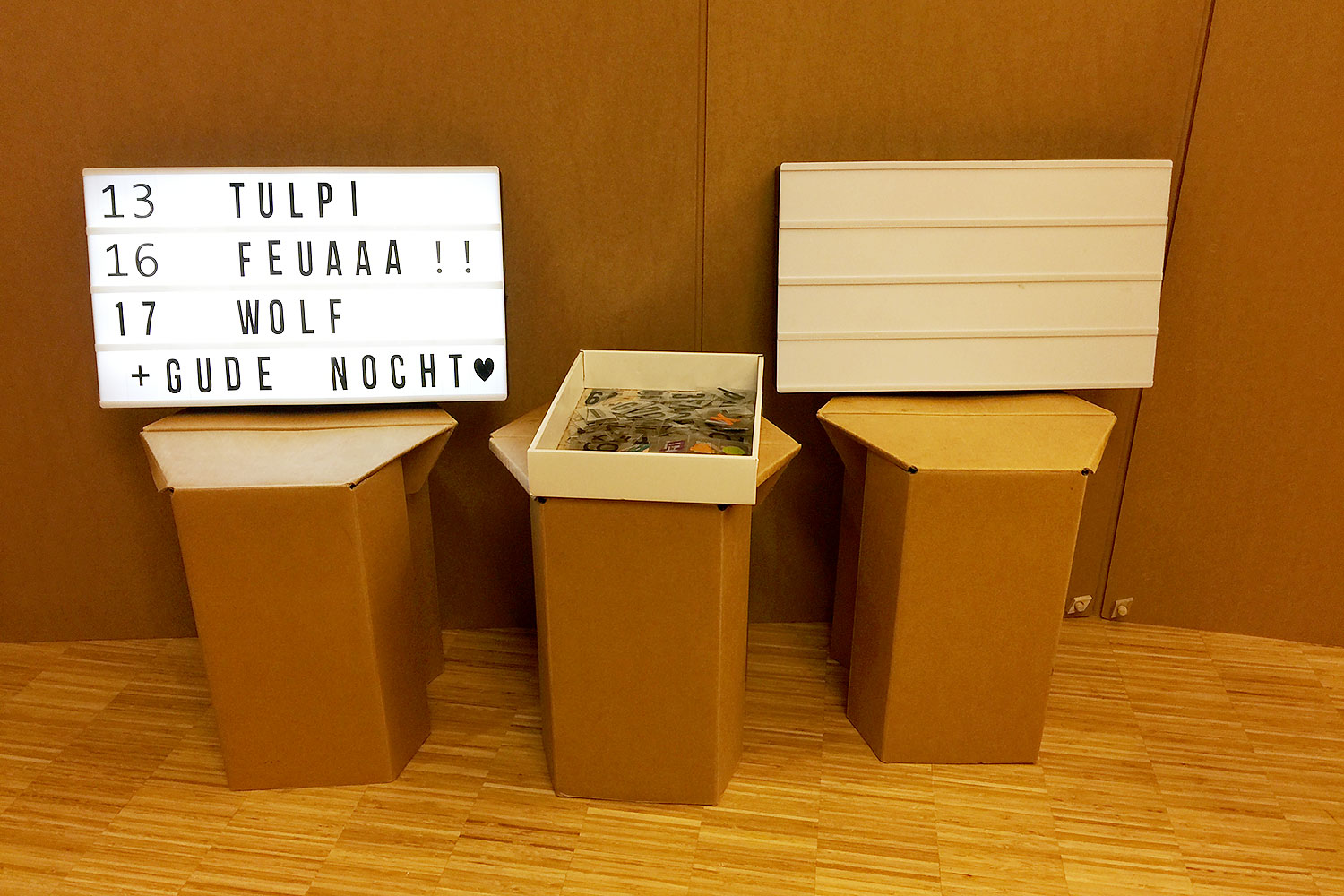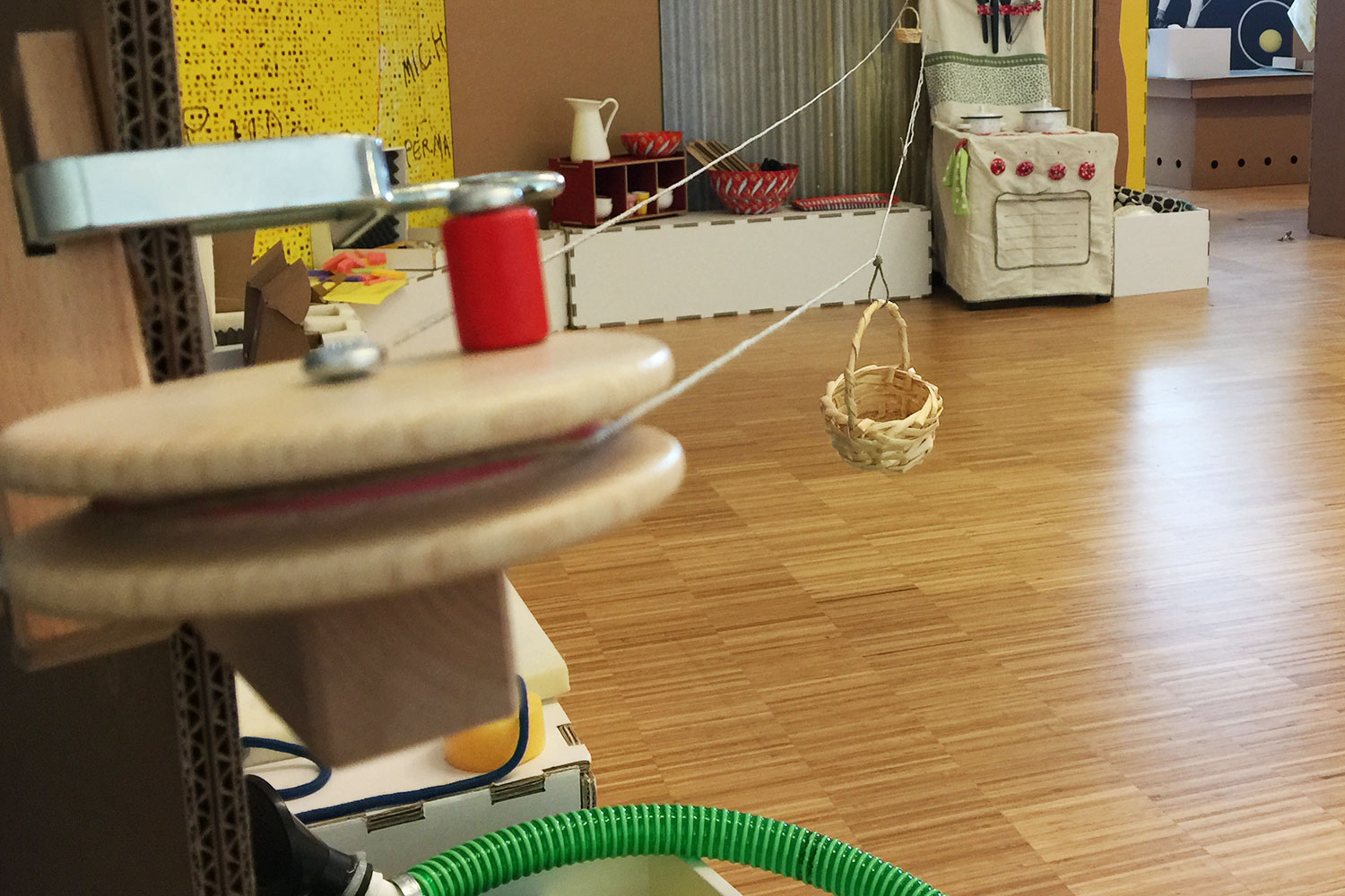 Nachricht auf die bunten Sprechklammern sprechen. Ins Körbchen legen, durch Kurbeln versenden. Gespannt warten, welche Antwort zurückkommt.