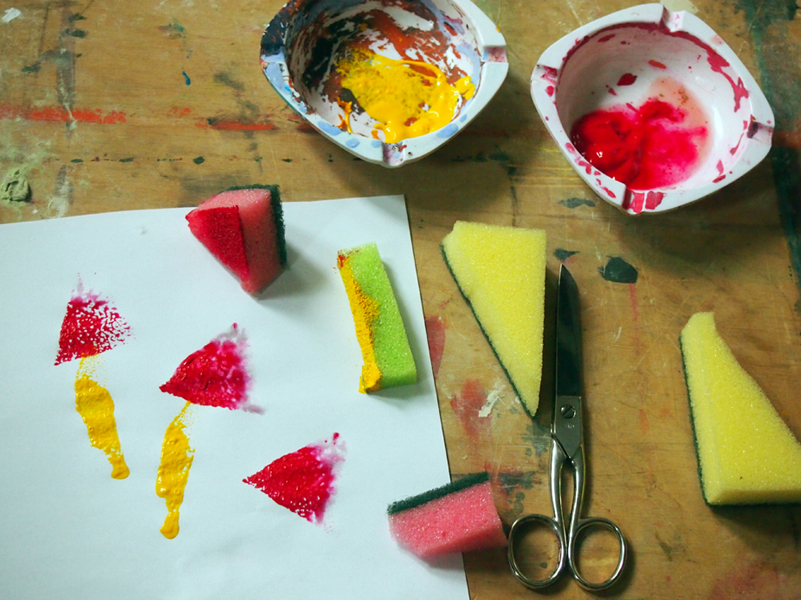 Tisch mit Schwämmen und Farbe