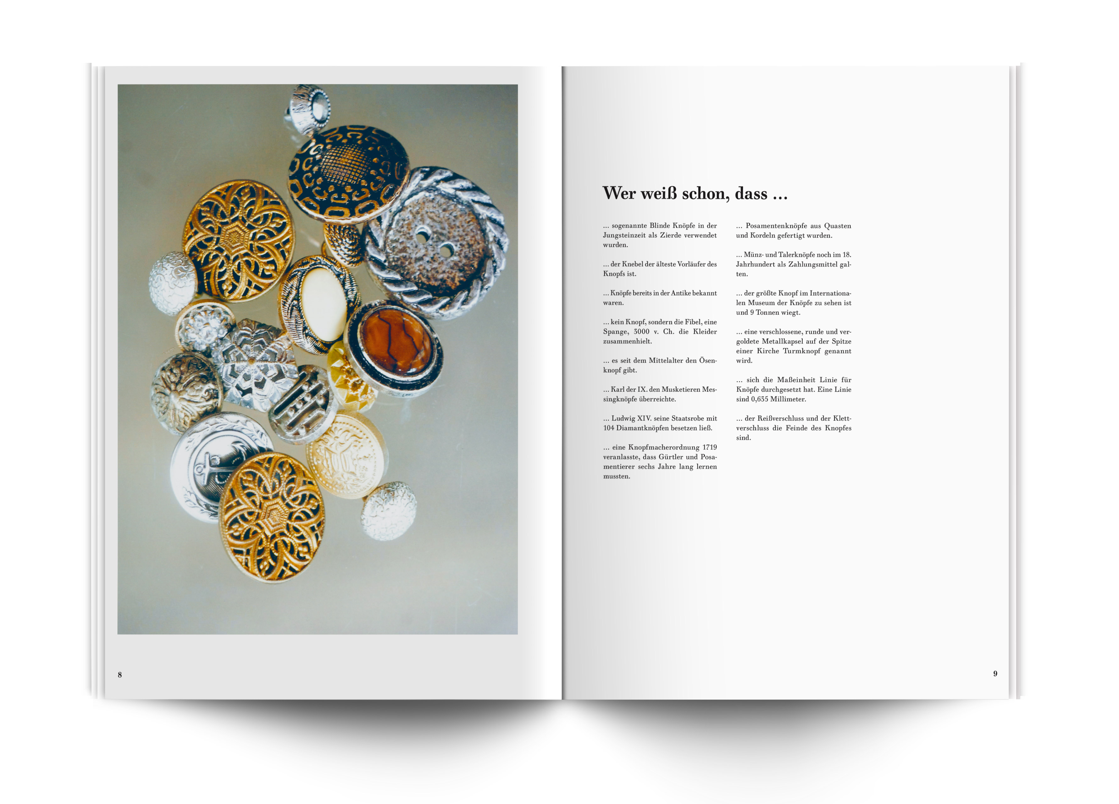 Eine Abteilung bekommen die Knöpfe, die sich im Laufe der Zeit ansammeln. In verschiedenen Gefäßen, kleinen und großen Gläsern oder Schachteln warteten sie darauf, dass jemand sich ihrer annimmt. Dann erzählten sie von vergangenen Zeiten, von den Kleidungsstücken, die sie zierten oder verschlossen, von ihrem Werdegang, vom Schicksal des verlorenen Knopfs und von der Knopf-Parade. Es ist erstaunlich, was ein Knopf ins Rollen bringen kann und was in ihm steckt. Hören Sie zu und sehen Sie sich an, was Knöpfe zu sagen haben und welche ihrer 100 Sprachen ihnen zu entlocken sind.
