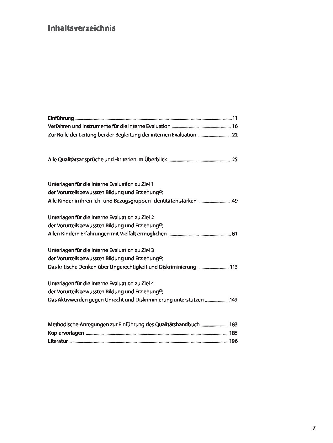 Das Qualitätshandbuch für Vorurteilsbewusste Bildung und Erziehung in Kitas enthält alle wichtigen Verfahren und Instrumente für die interne Evaluation zur Weiterentwicklung inklusiver pädagogischer Praxis. Das Qualitätshandbuch ist ein Leitfaden für Kitateams, mit dem diese ihre pädagogische Qualität bezogen auf vier Handlungsfelder der Praxis im Hinblick auf Inklusion weiter entwickeln können. Qualitätskriterien machen konkret, woran sich vorurteilsbewusste Kitapraxis erkennen lässt. Sie dienen der Überprüfung und systematischen Weiterentwicklung inklusiver Qualität. Das Qualitätshandbuch unterstützt begriffliche, konzeptionelle und Werte-Klärungen. Es ist ein wichtiges Instrument zur systematischen Implementierung Vorurteilsbewusster Bildung und Erziehung in der Kitapraxis.