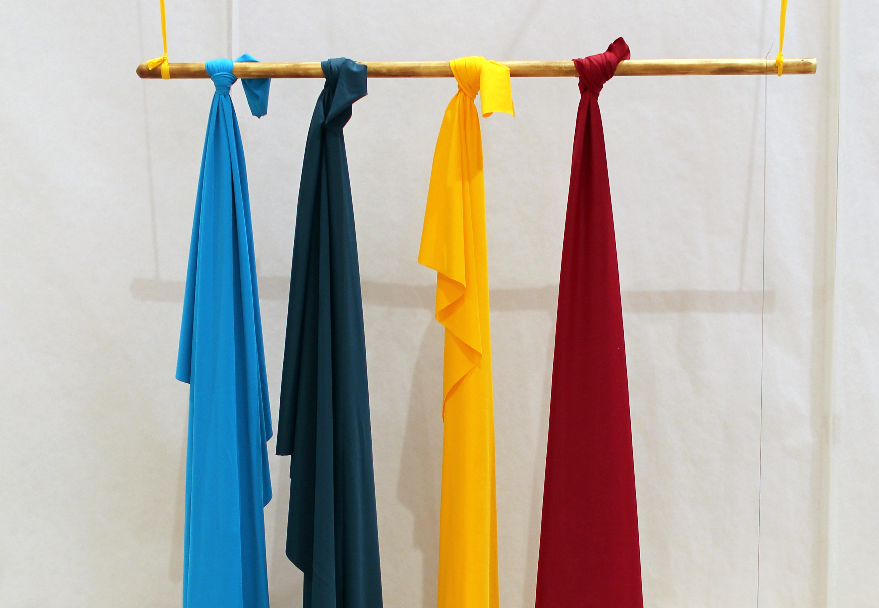 Das „le bonbond klein“ ist vertikal wunderbar geeignet, um sich schaukelnd in die Umgebung zu hängen oder für ein Nickerchen zurückzuziehen. Dafür wird ein fixer Punkt wie ein Deckenhaken, eine Stange, ein Balken, ein stabiles Geländer oder ein Ast in der Natur benötigt. Zu dem Bonbond wird eine Bandschlinge aus dem Klettersport mitgeliefert. Mit dieser kann das Bonbond dann an dem fixen Punkt befestigt und schnell wieder abgenommen werden. Und so geht das Aufhängen des Tuchs: